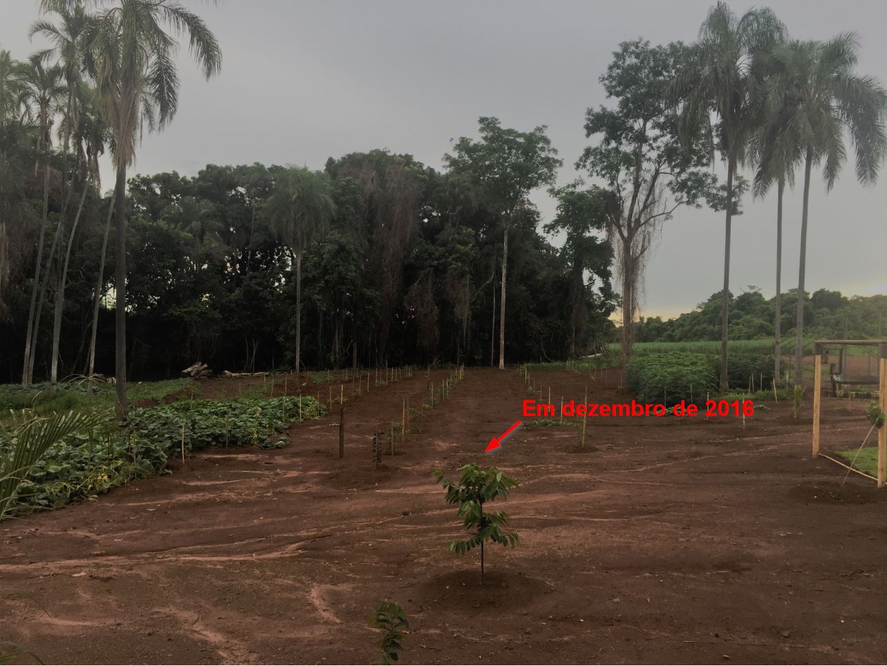 Em 2016 uma área que estava degrada foi reconstituída voluntariamente. Foram plantadas mais de 100 espécies no local.Essa foto retrata o inicio do trabalho.